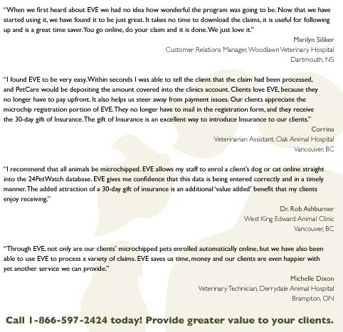 Eve – Electronic Veterinary Experience is a trademark of Pethealth Inc. and is used with permission.